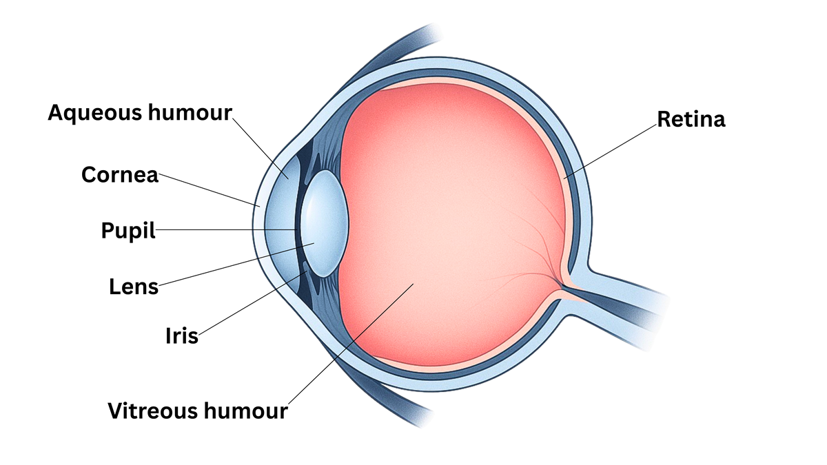 Light reflected off an object enters the eye through the cornea, the clear layer at the front of the eye. The cornea bends the light, which then passes through the aqueous humour, a watery substance filling the area behind the cornea.